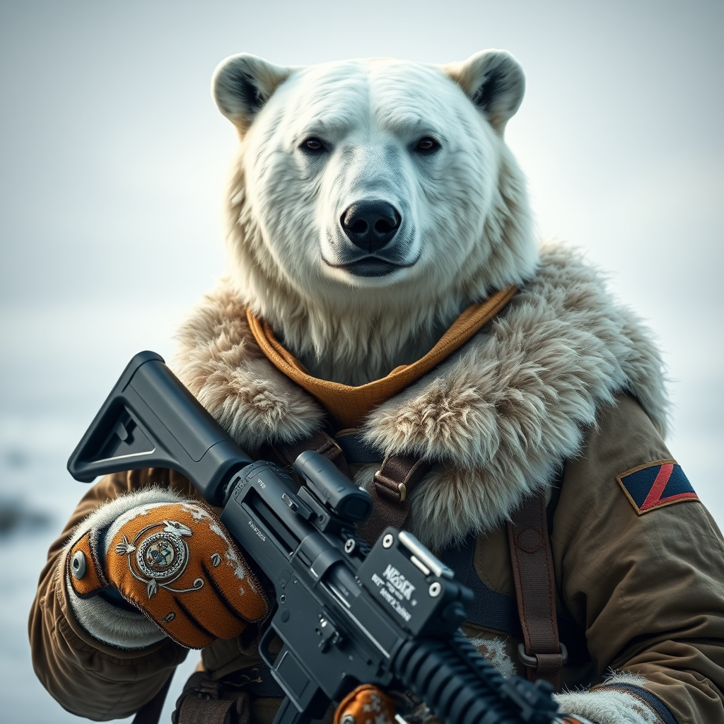 A valiant polar bear dressed in a detailed arctic military uniform, gripping a carbine rifle, with human-like features, strikingly realistic, ultra high-definition, 8k quality, showcasing intricate facial expressions, cinematic illumination, set against a stark icy backdrop, aspect ratio 9:16, quality level 2, style level 750.