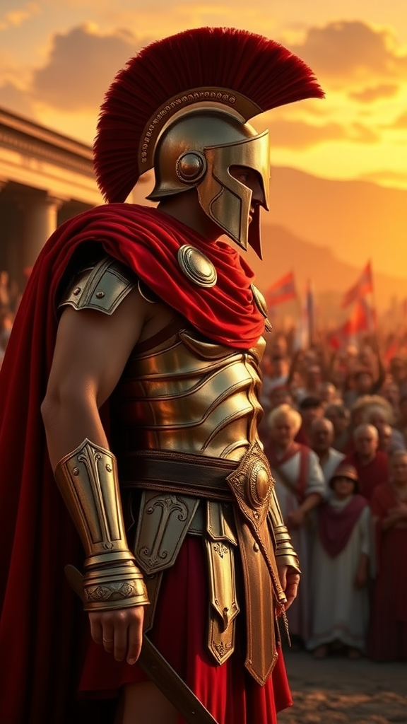 A valiant Spartan warrior stands poised in a striking palette of dark crimson and gold, embodying the grandeur of academic classicism. The scene is captured in breathtaking 32k UHD resolution, set against spectacular backdrops that evoke ancient Greece. The warrior's armor gleams with bronze playfulness, accented by the glow of a setting sun. An atmosphere of anticipation fills the air, as a detailed crowd of onlookers surrounds the scene, their expressions a mix of admiration and awe. This Associated Press photo captures a moment frozen in time, where history and art blend seamlessly. The composition is stylized, maintaining a dynamic balance between vivid realism and the mythic aura of a legendary past.