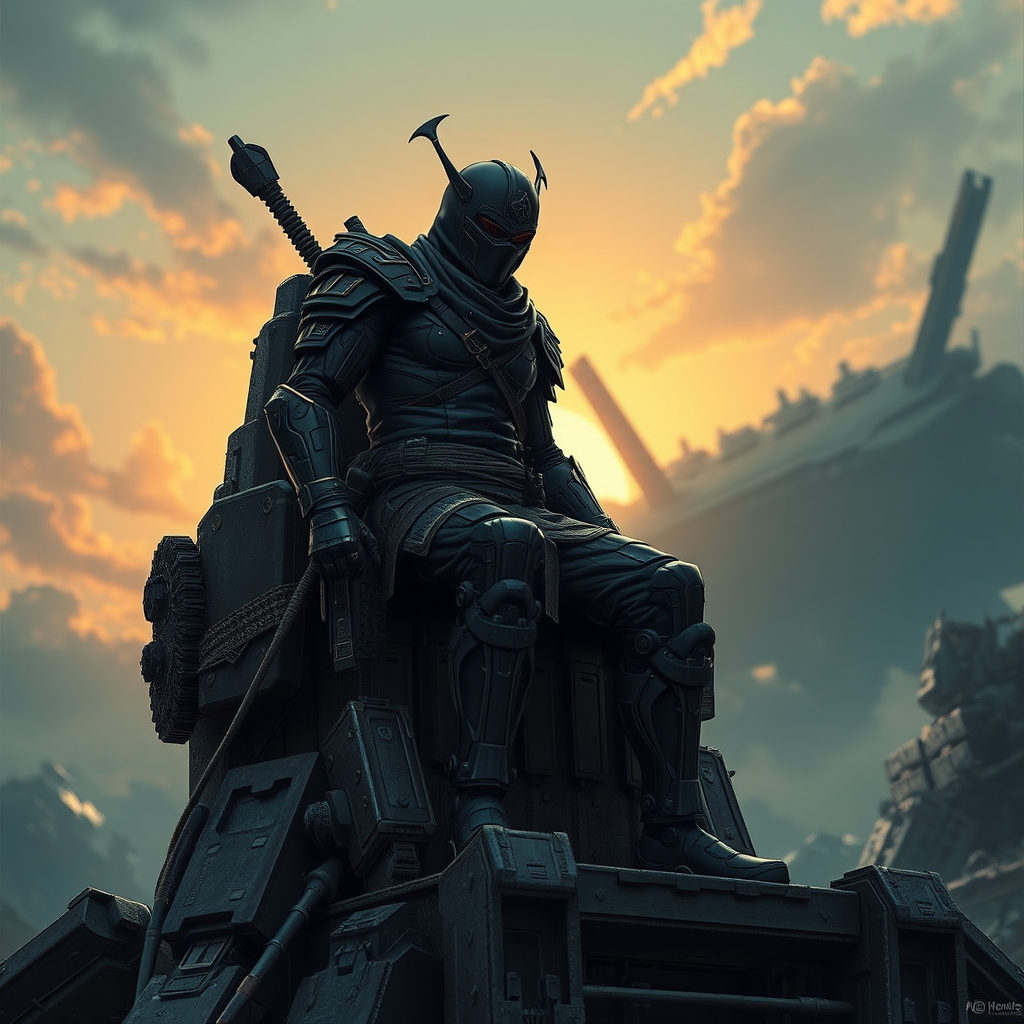 A valiant warrior clad in a detailed, futuristic black ninja suit sits confidently atop a throne forged from vanquished robots, his physique perfectly proportioned. Drawing inspiration from Soviet-era poster art, the scene captures a sense of triumph and strength. In the backdrop, the remnants of a defeated mech loom, partially obscured by the soft glow of dawn. Rendered in anime and manga styles, the design features dark, rich colors and intricate details reminiscent of offset printing. The image embodies a cinematic quality, with high-definition 8K resolution and CMYK richness, blending epic storytelling with striking visual impact.