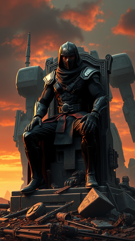 A valiant warrior garbed in an intricately designed, futuristic black ninja suit sits confidently atop a throne made from the remains of defeated robots, his physique perfectly proportioned. The scene is styled reminiscent of a Soviet poster, capturing the essence of USSR propaganda art with a modern twist. In the background, a damaged robotic mech looms, adding a gritty depth to the setting. The dawn lighting casts dramatic shadows and highlights across the landscape, its tones enriched by anime and manga graphic influences. The composition is rendered in dark, sumptuous colors, embodying the texture and richness of offset printing. This 8K, high-definition image is designed using CMYK color processes, offering an epic, cinematic feel with meticulous detail. The poster is an arresting vision of strength and resilience, blending nostalgic themes with futuristic elements.