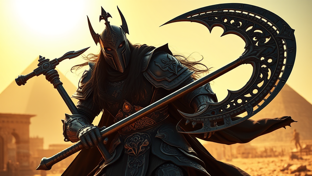 A vampire knight inspired by Arthas from WarCraft, wielding a menacing war scythe, clad in intricately carved full-plate armor. His helmet lacks a visor, allowing long, flowing hair to cascade down as he charges forward, fangs bared in a fierce attack. Set against the vibrant sunlight of an ancient Egyptian landscape, this epic fantasy scene melds dark elements with realistic, hyper-detailed design. The cinematic lighting enhances the scene, casting dramatic shadows over the hyper-realistic figure, who embodies the fusion of classical and dark fantasy aesthetics, making for a striking character design that captures the imagination.