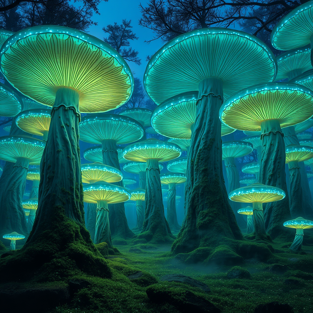 A vast forest of towering, radiant mushrooms casting a soft luminescent glow in shades of blue and green, their intricate patterns shimmering under the twilight sky. The forest floor is carpeted with moss and tiny sparkling spores, creating an otherworldly landscape where the air is filled with a gentle, ethereal luminescence, evoking a sense of wonder and mystery. A faint mist swirls around the base of the mushrooms, enhancing the surreal atmosphere.