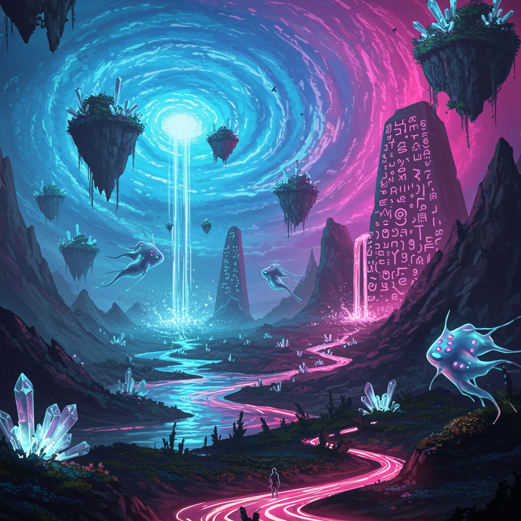 A vast landscape under a swirling, pulsating sky of electric blue and violent pink, where gravity defies itself and floating islands are adorned with crystalline trees. Unusual, translucent creatures with spiral limbs drift through the air, their bioluminescent skin casting eerie shadows on the ground. Rivers of liquid light flow upward, entwining around mountainous monoliths covered in pulsating hieroglyphics of an unknown language. Everything glows with an unsettling luminescence, as if the very air hums with mysterious energy.