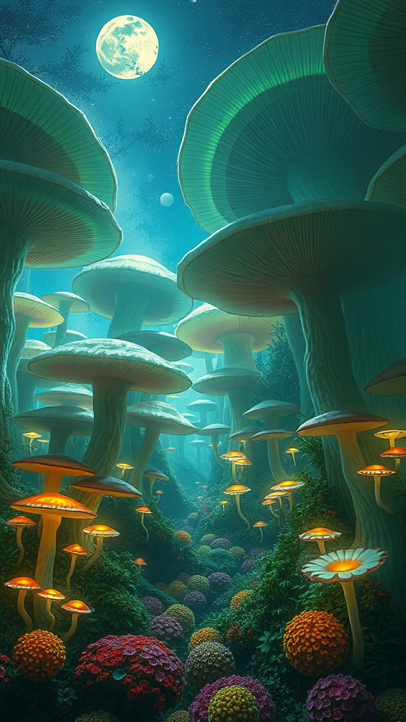 A vast, luminescent forest of towering mushrooms, their caps radiating a gentle, ethereal glow that bathes the surroundings in a mystical light. The forest floor is a tapestry of intricate patterns formed by vibrant fungi, while soft bioluminescent spores float lazily in the air, casting shimmering reflections. Moonlight filters through the dense canopy, highlighting the diverse shapes and colors of the mushroom caps, creating an enchanting and otherworldly atmosphere. Majestic mushroom stems twist and curve, forming natural arches and pathways that invite exploration and adventure.