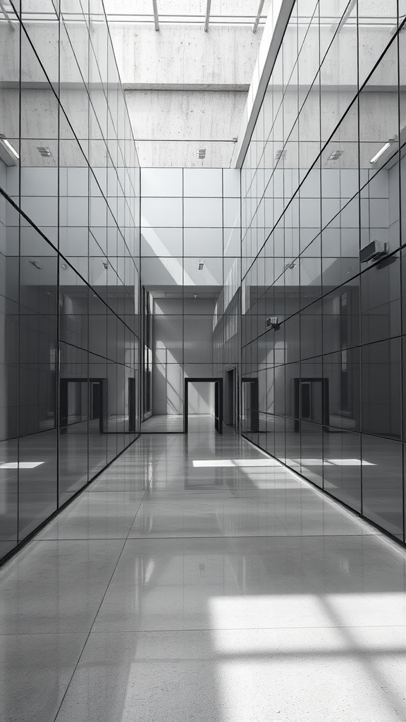 A vast space featuring an interplay of mirrors and sleek metalwork, embodying minimalist monochromes with a structured grid aesthetic. Post-processed with precision, showcasing clean lines in a palette of dark silver and pristine white. The environment blends concrete textures and architectural competition themes, emphasizing personal expression through realistic lighting. Silhouettes and shadows interplay within the space, adding depth and subtle dynamism to the raw, unadulterated style.