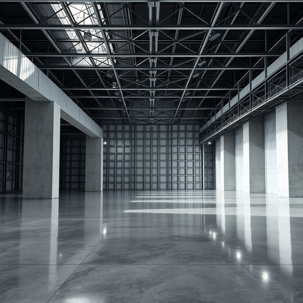 A vast space with reflective surfaces and intricate metal craftsmanship, inspired by minimalist monochrome aesthetics. The environment is structured around a grid pattern, featuring clean lines and a palette of dark silver and white. Concrete elements accentuate an architectural competition entry focused on personal expression. The scene is lit with realistic lighting that emphasizes the raw, unembellished style, evoking a sense of serene sophistication.