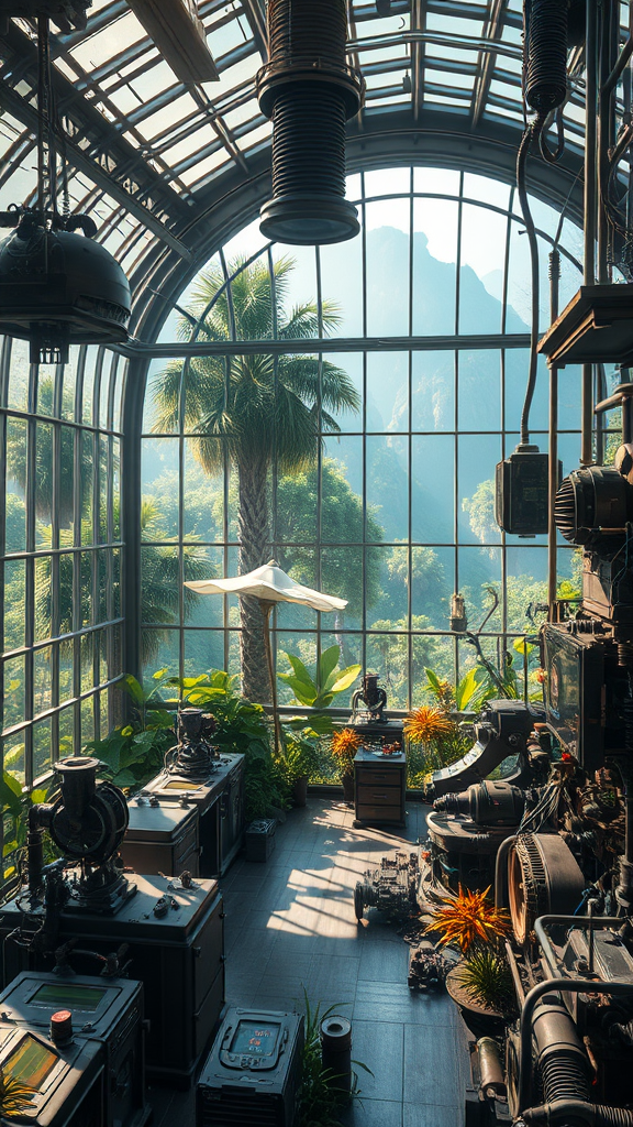 A vast steampunk-themed scientific laboratory interior featuring intricate machinery and advanced technology, set against the backdrop of lush jungle trees and vibrant, colorful plants visible through expansive greenhouse windows. Sunlight streams in, casting intricate patterns across the room, while the panorama of epic landscapes stretches beyond. The scene is inspired by the works of Quentin Mabille, Craig Mullins, and Romain Jouandeau, capturing a hyper-detailed and hyper-realistic aesthetic reminiscent of trending ArtStation matte paintings. An 8k resolution elevates the clarity, while elements are vividly detailed to immerse the viewer in this imaginative world, offering a sense of discovery and wonder without any blurring.