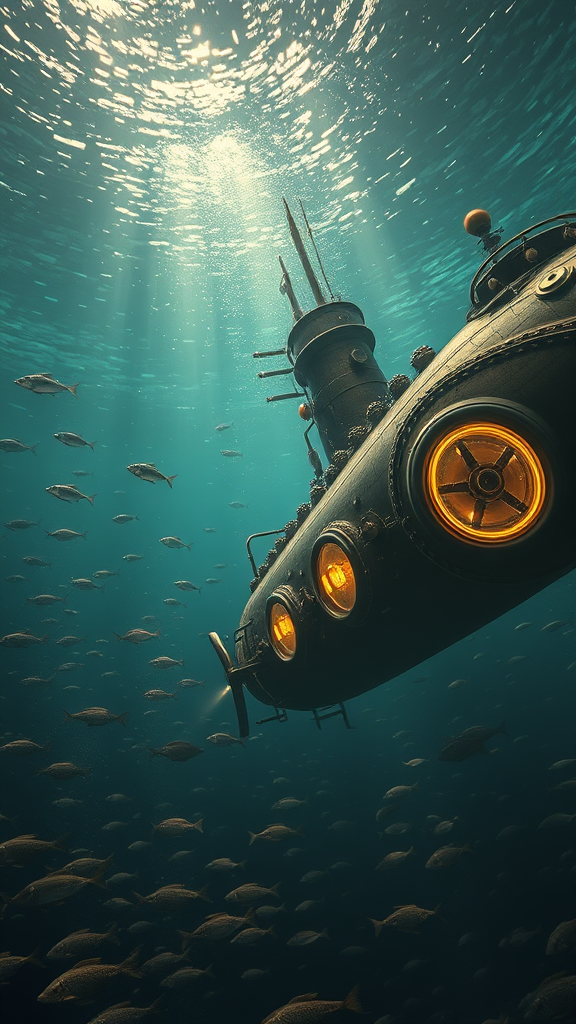 A vast underwater scene showcasing a steampunk submarine reminiscent of Jules Verne's Nautilus, intricately designed with ornate brass and copper elements, large circular windows glowing softly, and propellers gently whirring, surrounded by ethereal schools of fish and shimmering light filtering through the ocean depths, casting a mysterious, otherworldly aura over the entire spectacle.