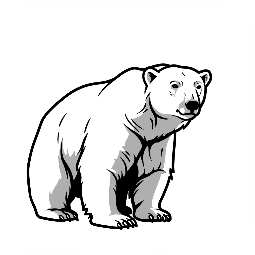 A vector illustration of a polar bear conveying an unusual style, featuring a sleek black and white design with crisp, bold lines. The outline art showcases the bear in a centered position, prominently isolated on a white background, maintaining clarity and simplicity. The design includes subtle creative accents, such as slightly exaggerated features, to add uniqueness, while preserving the overall essence of the original concept.