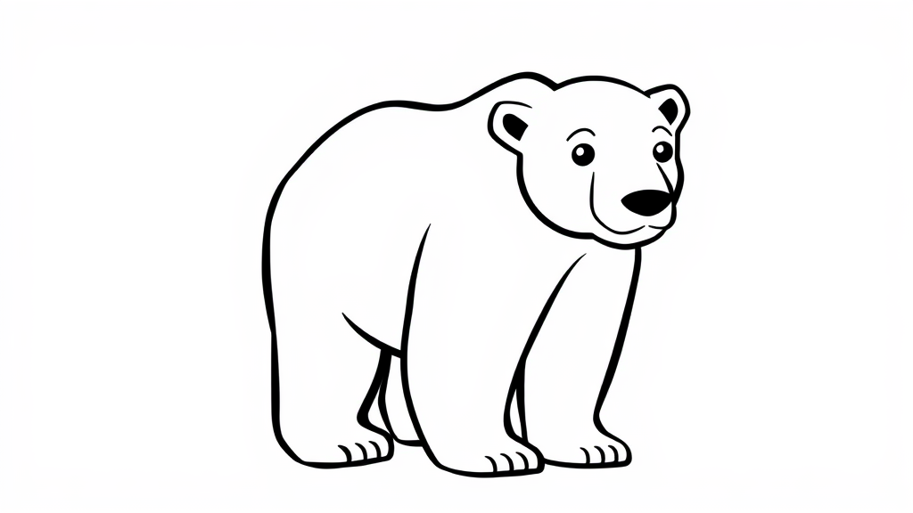 A vector illustration of a polar bear in an unusual style, featuring bold and crisp thick lines in black and white, with an outline art approach. The image is centered and isolated on a white background, with the bear’s posture slightly dynamic to convey a sense of movement. Its eyes have a touch of character, adding a playful element while maintaining the minimalist aesthetic.