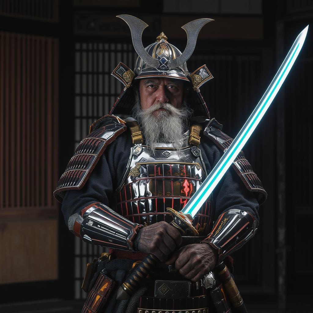 A venerable grandfather clad in intricately detailed samurai armor fused with techwear elements, showcasing a harmonious blend of tradition and futuristic design. The ultra-realistic portrayal captures the wisdom in his eyes, the intricate patterns on the armor reflecting the studio lighting that illuminates the scene with precision. His hands, steady and skilled, hold a futuristic katana, the blade gleaming with technological enhancements. The backdrop is a subtle balance of tradition and modernity, enhancing the aura of strength and history surrounding him.