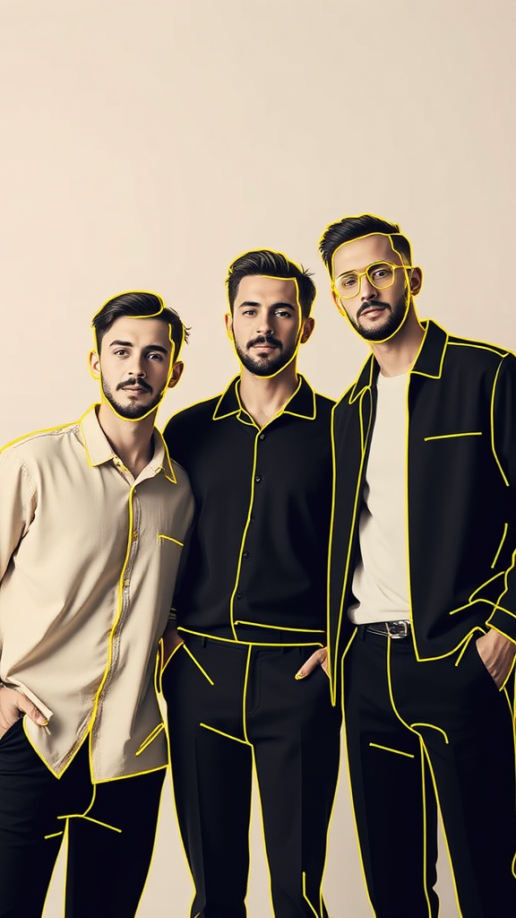 A vertical composition featuring three men with minimalistic yellow outlines, each in varied poses that convey a sense of unity and individuality, set against a soft, neutral background to emphasize the vibrant outlines and capture a moment of connection.