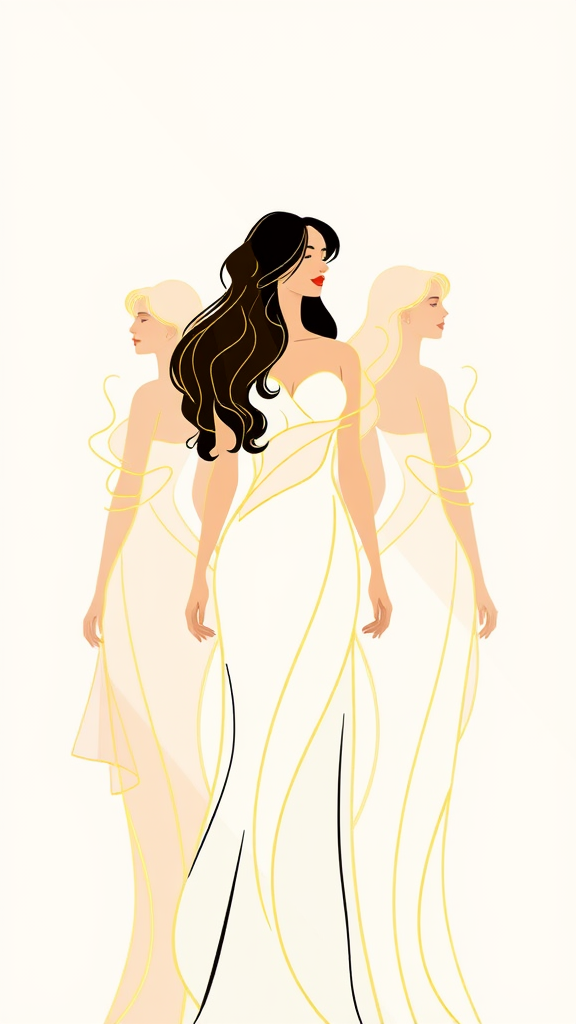 A vertical illustration featuring three women with graceful yellow outlines, each exuding unique personalities and interconnected energy against a minimalist background, with sunlight casting soft highlights on their forms, creating a serene yet vibrant composition.