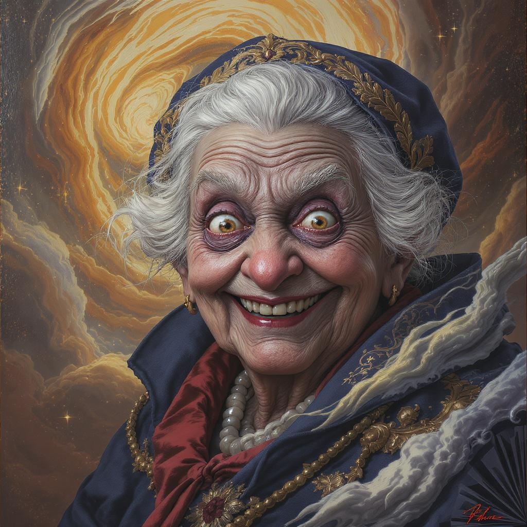 A very ancient and eccentric grandmother with a mischievous grin, enveloped in a surreal sky of swirling madness, inspired by Mundford. The scene embodies baroque maximalism with a chibi twist from the world of Artificial Nightmares. Infused with the dark and whimsical essence of Tim Burton and the striking artistry of Stanley Artgerm, her face is adorned with intricate details and sharp, penetrating eyes. The composition is photorealistic and dynamic, capturing an organic and ultra-realistic presence with high-definition precision. The artwork boasts crisp, intricate detailing and immaculate composition, resembling a masterpiece oil painting on canvas. Echoes of Raphael and the dramatic chiaroscuro of Caravaggio are evident, interwoven with the imaginative essence of Greg Rutkowski, Beeple, Beksinski, and Giger. This 8k artistic photograph commands attention on ArtStation, with its perfect blend of soft, natural volumetric lighting and cinematic brilliance, capturing an award-winning moment of creative grandeur.