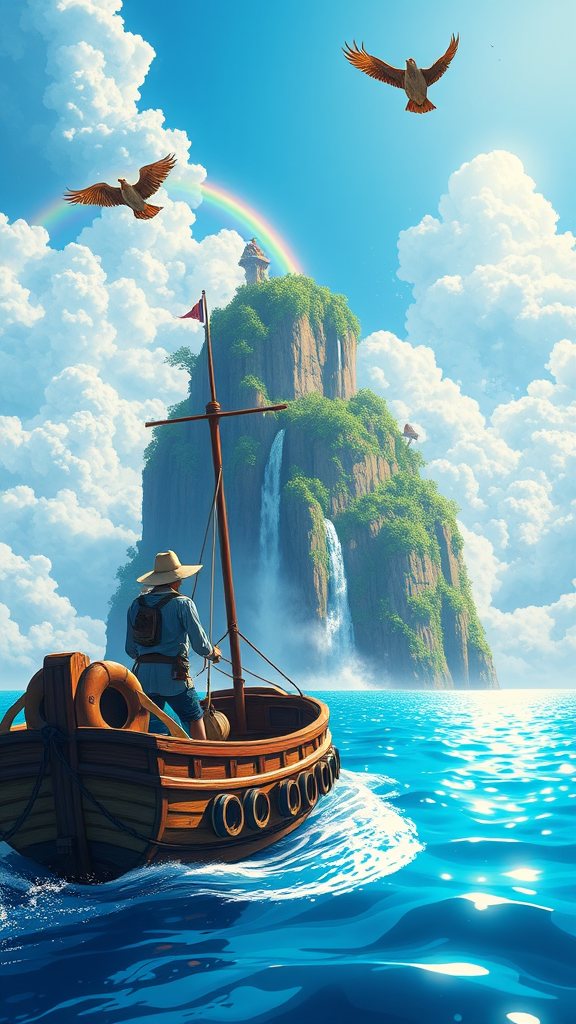 A vibrant 16-bit pixel art scene depicts an intrepid explorer steering a sturdy boat toward a mystical island floating amidst fluffy, sun-drenched clouds, inspired by studio ghibli's enchanting style. The cinematic still captures the explorer's awe as towering waterfalls cascade down the island's verdant cliffs, creating rainbow arcs in the bright HDR light that bathes the scene. The boat, adorned with nautical details, cuts gracefully through the shimmering, sky-blue sea below, as exotic birds soar overhead, enhancing the sense of discovery and adventure.