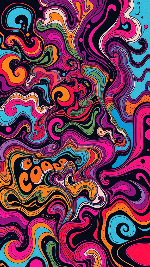 A vibrant 1970s rock band album cover featuring psychedelic patterns with swirling, bold colors; a vintage feel evoking the era's expressive music, with abstract shapes and fluid forms merging into a harmonious yet dynamic design.