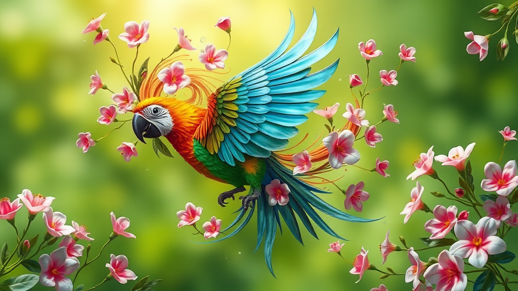 A vibrant 3D abstract shape resembling a parrot in flight, seamlessly integrated with swirling foliage and blossoming flowers, radiating a soft, ethereal glow against a lush, emerald green backdrop.