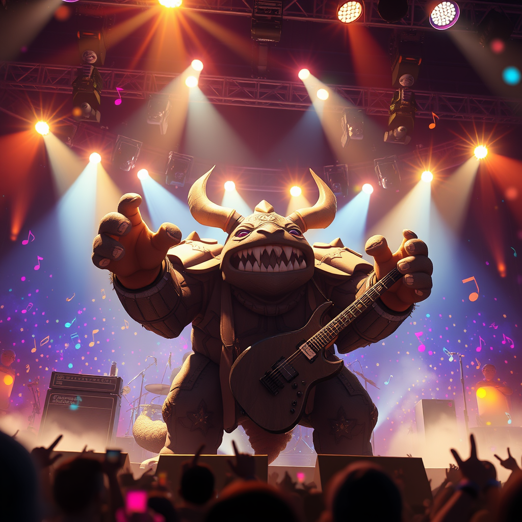 A vibrant 3D animation key shot capturing a powerful band behemoth energetically performing on stage under dazzling lights, inspired by the enchanting styles of Studio Ghibli, Pixar, and Disney. The scene is rendered in Unreal Engine 5, with sharp, detailed visuals and anime-inspired key art reminiscent of Greg Rutkowski. The atmosphere is filled with a magical bloom effect and dramatic, dynamic lighting that highlights the excitement of the performance, creating a warm and inviting setting where colorful musical notes seem to dance around the behemoth, amplifying the joy and energy of the moment.
