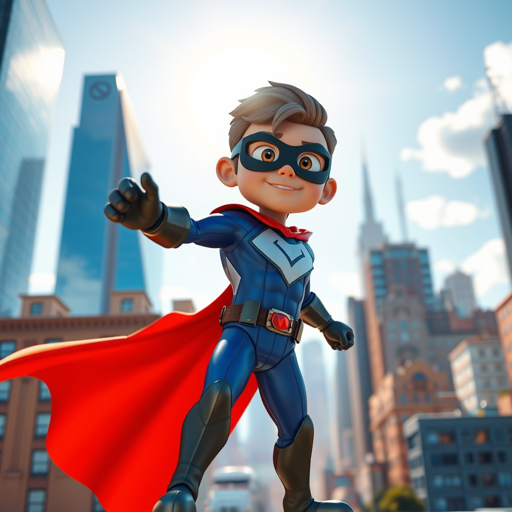 A vibrant 3D cartoon image depicting a heroic figure in full costume with vivid colors and dynamic details, reminiscent of a Pixar-style animation. The scene captures a sunny, bright atmosphere with dramatic cinematic lighting, showcasing the superhero in an action-packed pose. The elongated aspect ratio emphasizes the grandeur of the cityscape background, adding depth and energy to the composition.
