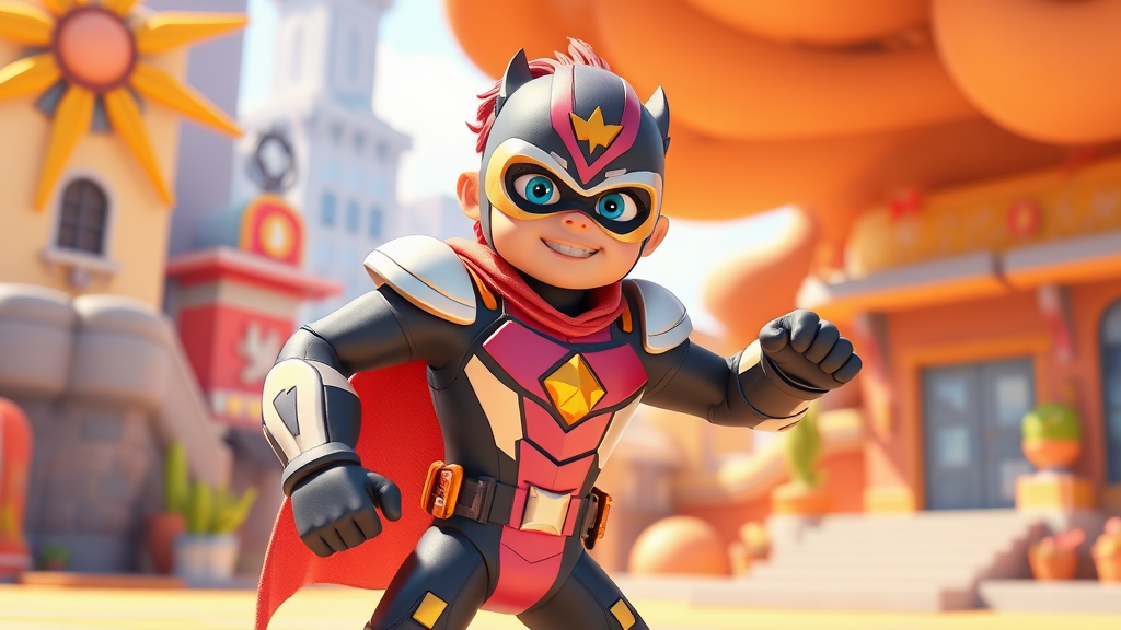 A vibrant 3D cartoon image in a sunny and bright style reminiscent of a Pixar film, featuring a dynamic superhero in a full, uniquely designed costume. The scene captures a cinematic moment with a bold, colorful backdrop, showcasing intricate details and textures on the costume and surroundings. The hero strikes a confident, action-ready pose, embodying a sense of adventure and optimism.
