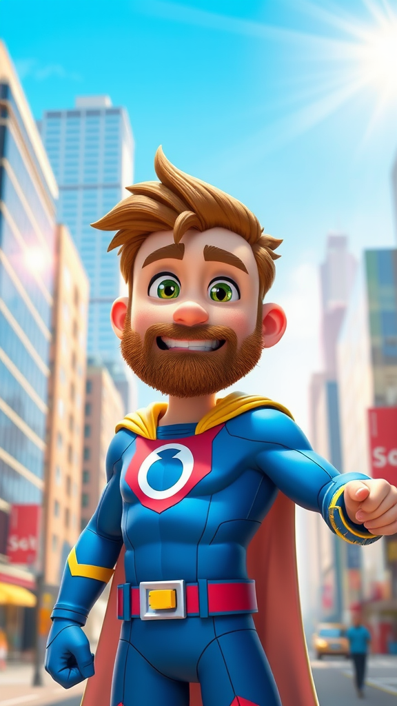 A vibrant 3D cartoon in a sunny, bright, Pixar-like style featuring a 35-year-old superhero with a light brown beard and freckles. The character is in a dynamic pose wearing a full superhero costume with vivid colors and intricate details. The setting is a bustling cityscape with a clear blue sky and sun rays reflecting on glass buildings. The atmosphere is cinematic with a touch of whimsy, showcasing an inspiring scene where the superhero appears confident and ready for action. The aspect ratio emphasizes height, giving a majestic feel to the character.