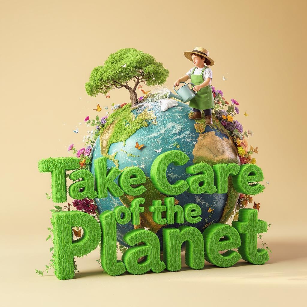 A vibrant 3D illustration of a gardener standing on a large globe, delicately watering it. The globe is beautifully adorned with lush green leaves and fluttering butterflies, symbolizing the Earth's vitality and splendor. The serene backdrop is a soft beige hue, while the phrase "Take care of the Planet" is prominently showcased in 3D, crafted from green foliage and casting gentle shadows, reminding us of our duty towards environmental stewardship. The scene is harmonious and perfectly composed, with realistic anatomy and natural expressions, capturing the essence of nurturing our planet.