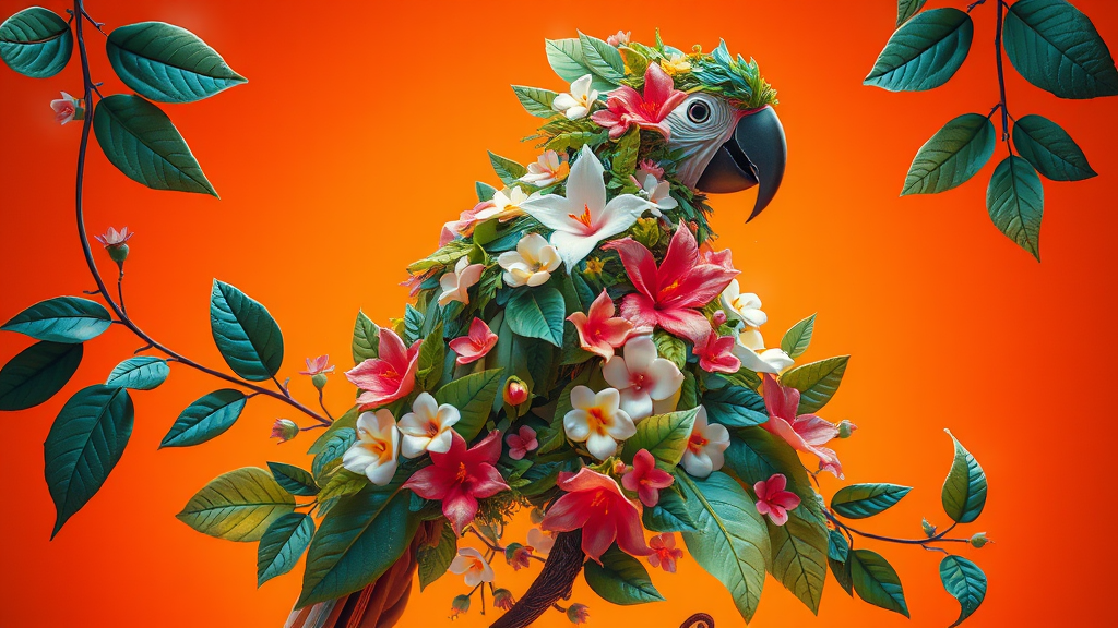 A vibrant 3D parrot shape intricately woven with lush foliage and delicate flowers, each petal and leaf shimmering with a soft, ethereal glow, against a warm orange backdrop. The abstract form merges nature with luminescence, creating a whimsical and enchanting spectacle.