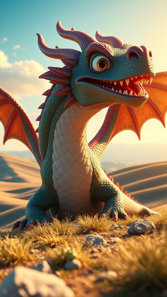 A vibrant 3D Pixar-style image featuring a majestic dragon basking in a sunlit landscape with vivid colors and dynamic lighting, showcasing intricate scales and expressive eyes against a backdrop of rolling hills and clear skies, evoking a sense of wonder and cinematic grandeur, with a touch of whimsy and fantasy elements seamlessly woven in.