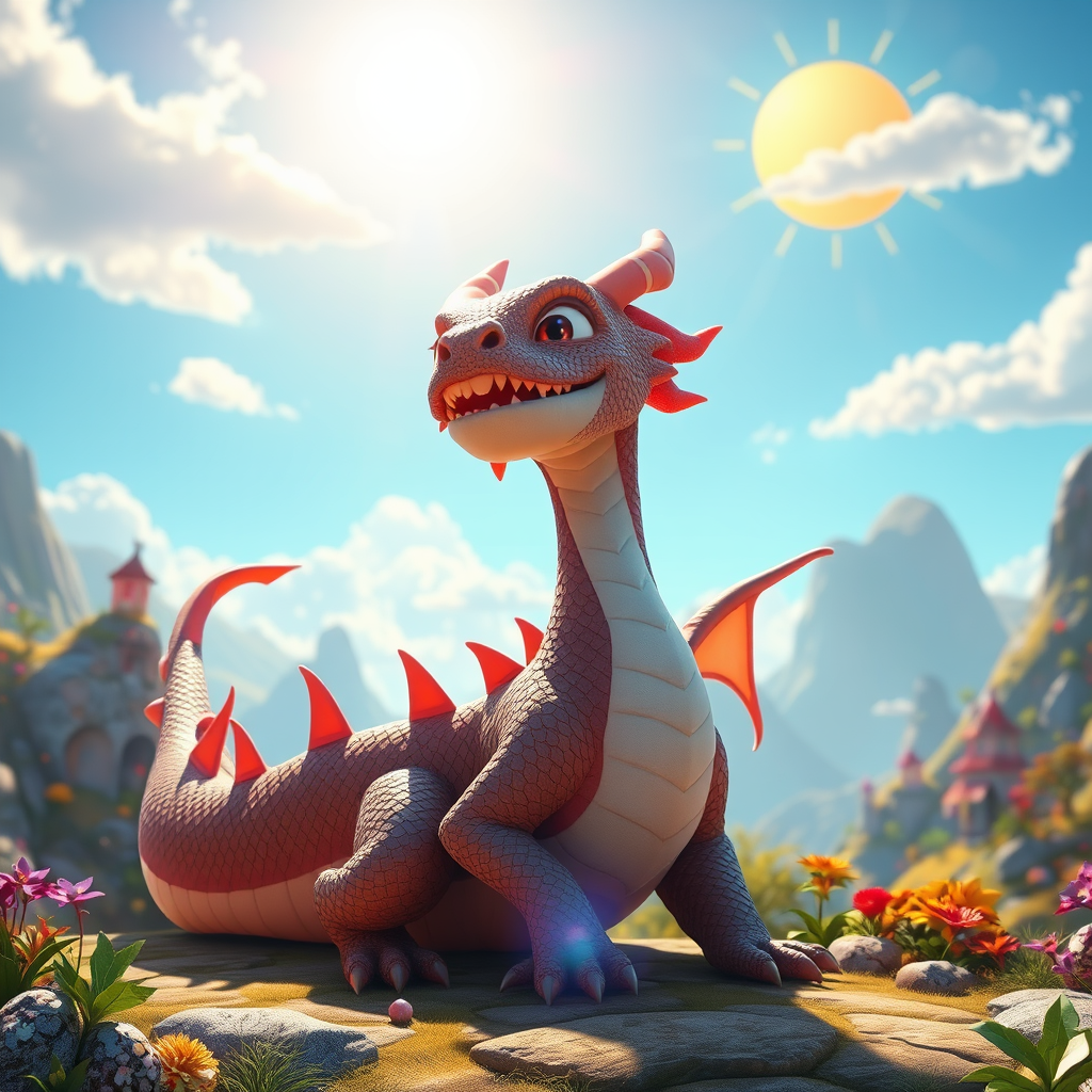 A vibrant 3D Pixar-style scene featuring a majestic dragon basking under a radiant sun, surrounded by lush, colorful landscapes with whimsical details and a cinematic feel, the dragon's scales glistening in the sunlight with an enchanting and lively aura.