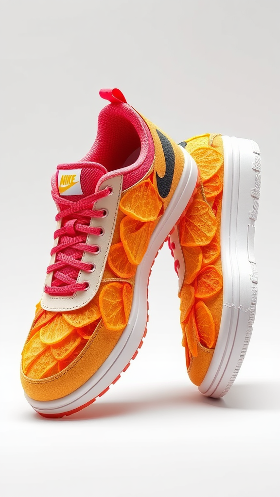 A vibrant 3D render of a pair of sneakers crafted from sun-dried fruit peels, showcasing an explosion of bright colors and a sleek composition with the iconic Nike swoosh artfully integrated, resulting in an exquisite and innovative design.