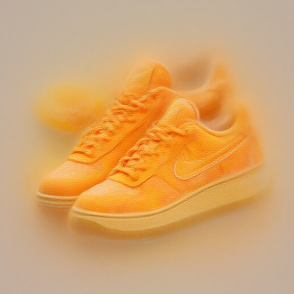 A vibrant 3D render of a pair of sneakers crafted from dried fruit peels, showcasing an array of bright, eye-catching colors, featuring a clean and minimalist composition, with intricate details highlighting the beauty of the design, complemented by the Nike logo creatively integrated into the artwork.