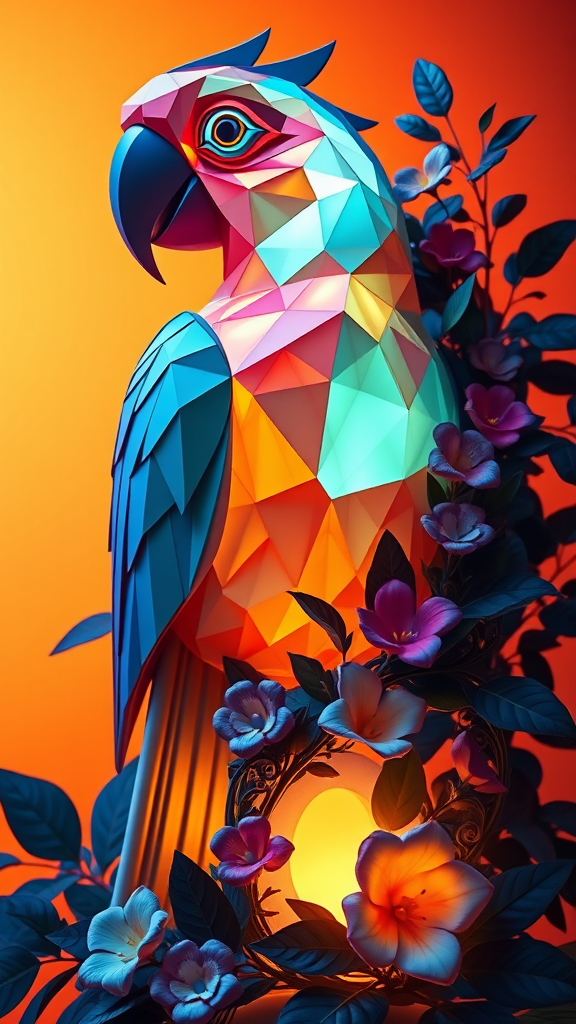 A vibrant 3D sculpture of a parrot with abstract, geometric features is entwined with lush foliage and delicate flowers. The parrot emanates a soft, ambient light that highlights its intricate design and the surrounding natural elements. The scene is set against a warm, gradient orange background, enhancing the overall glow and creating a harmonious balance between the bird and its botanical companions.