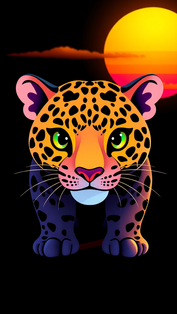 A vibrant 3D vector silhouette design of a jaguar with sharply defined eyes, set against a colorful sunset. The design features a quirky, cute aesthetic with a watercolor effect on a black background. The jaguar's form is low-poly, accentuated by soft lighting, creating a retro aesthetic. This digital painting, viewed from a bird's-eye perspective in an isometric style, focuses on the character with bright, bold colors. The scene is rendered photorealistically using Cinema 4D in 4K resolution, showcasing a front-facing view with subtle creative enhancements to highlight the jaguar's charming and dynamic presence.
