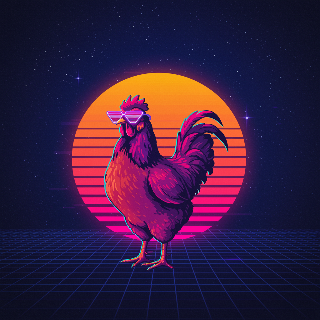 A vibrant 80s-inspired t-shirt design featuring a synthwave chicken adorned with neon-colored sunglasses. The chicken stands confidently against a stylized, minimalist retro sunset composed of bold orange and pink hues, with simple geometric lines accentuating the sun's descent. The dark blue and purple background provides a stark contrast, incorporating faint grid patterns reminiscent of classic synthwave aesthetics. Small glowing stars twinkle in the backdrop, adding a touch of cosmic flair to the scene.