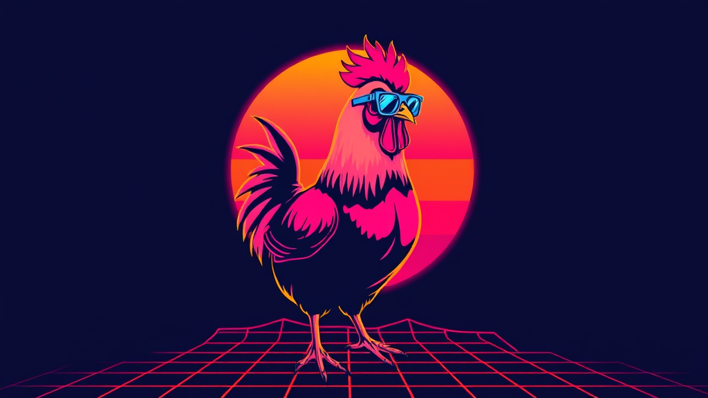 A vibrant 80s retro t-shirt design features a synth wave-inspired chicken, sporting sleek sunglasses. The chicken stands confidently against a minimalist neon sunset, where the warm hues smoothly transition from orange to pink, casting a nostalgic glow. The design boasts bold contours that emphasize the chicken's dynamic form and exude an electric energy. Set against a deep navy blue background, a grid pattern rises subtly from the bottom, adding depth and intrigue while maintaining the design's core essence.