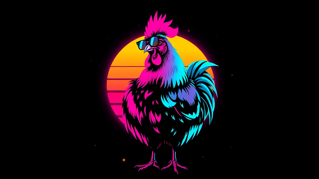 A vibrant 80s retro t-shirt design featuring a synth wave chicken decked out in sleek sunglasses, standing proudly in front of a minimalist neon sunset. The chicken's feathers are subtly highlighted with hints of electric blue and hot pink, reflecting the vivid hues of the retro era. The sun is stylized with bold, horizontal lines, casting an ambient glow across the scene. The dark background is dotted with faint, glimmering stars that add depth and a touch of futuristic allure, completing the nostalgic yet fresh aesthetic.