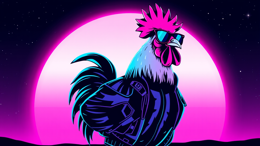 A vibrant 80s retro t-shirt design featuring a synth wave rooster sporting sleek sunglasses, standing confidently against a minimalist, neon-hued sunset. The rooster is adorned in a futuristic jacket with subtle geometric patterns, casting a playful silhouette against the dark, star-speckled background. The design is accentuated by electric blue and hot pink accents, creating a dynamic and nostalgic vibe.