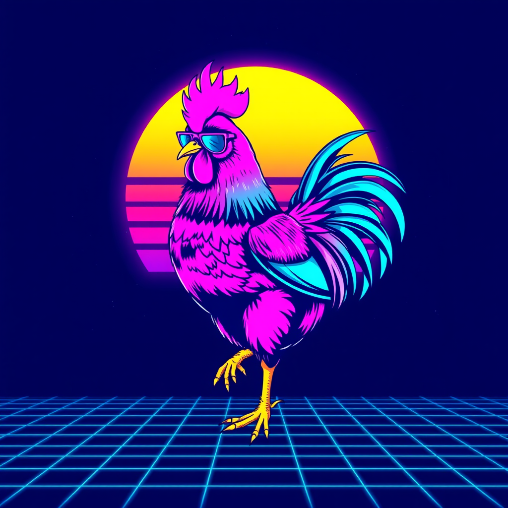 A vibrant 80s retro t-shirt design featuring a synthwave chicken sporting sleek aviator sunglasses, strutting confidently against a minimalist, neon-hued sunset. The background is a deep midnight blue, enhancing the chicken's luminous, fluorescent feathers that blend shades of electric pink, purple, and turquoise. Subtle grid lines crisscross the bottom, adding a touch of vintage futurism, while a soft retro glow envelops the scene, capturing the essence of nostalgic cool.