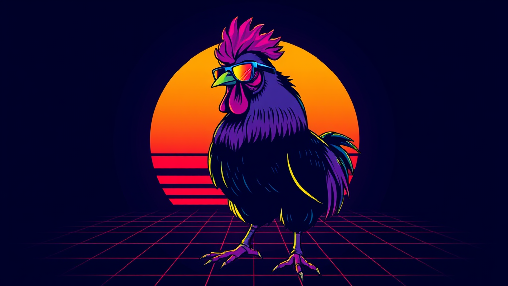 A vibrant 80s retro t-shirt graphic featuring a synth wave chicken, decked out in sleek sunglasses, set against a dynamic minimalist sunset. The chicken exudes a cool, futuristic vibe with neon accents, standing confidently in front of the warm hues of a sun dipping below the horizon, its rays forming a simple yet striking pattern. The background is a deep midnight blue, creating a stark contrast that highlights the chicken's bold silhouette and the sunset's rich colors. Subtle grid lines add a touch of retro-futurism, completing the nostalgic yet modern fusion.