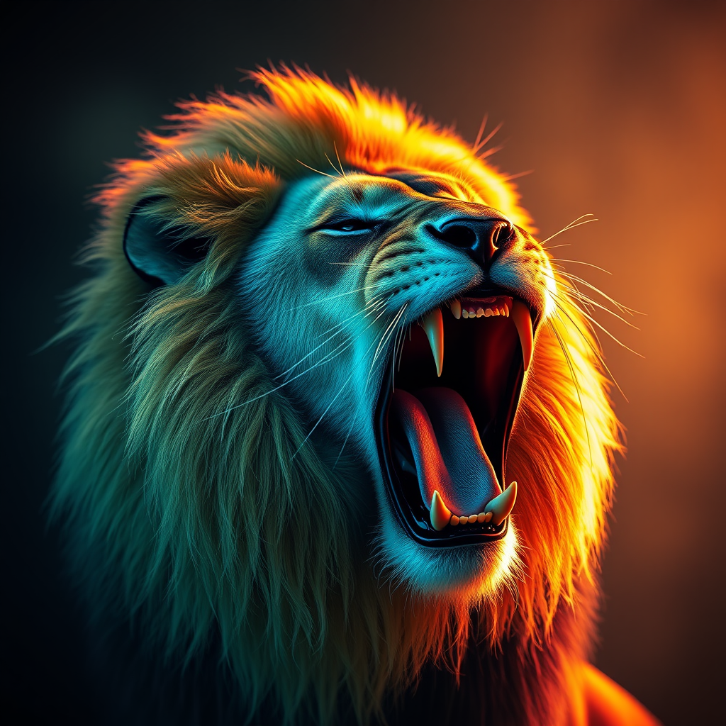 A vibrant 8k image of a lion roaring, its mane and whiskers glowing with a subtle bioluminescence that illuminates the scene, capturing the raw power and grace of the majestic creature. The soft light casts gentle shadows, creating an ethereal atmosphere that enhances the intensity of the lion's gaze. This captivating view, inspired by trending artwork on ArtStation, blends realism with fantasy, showcasing the lion's fierce energy in a breathtaking display.