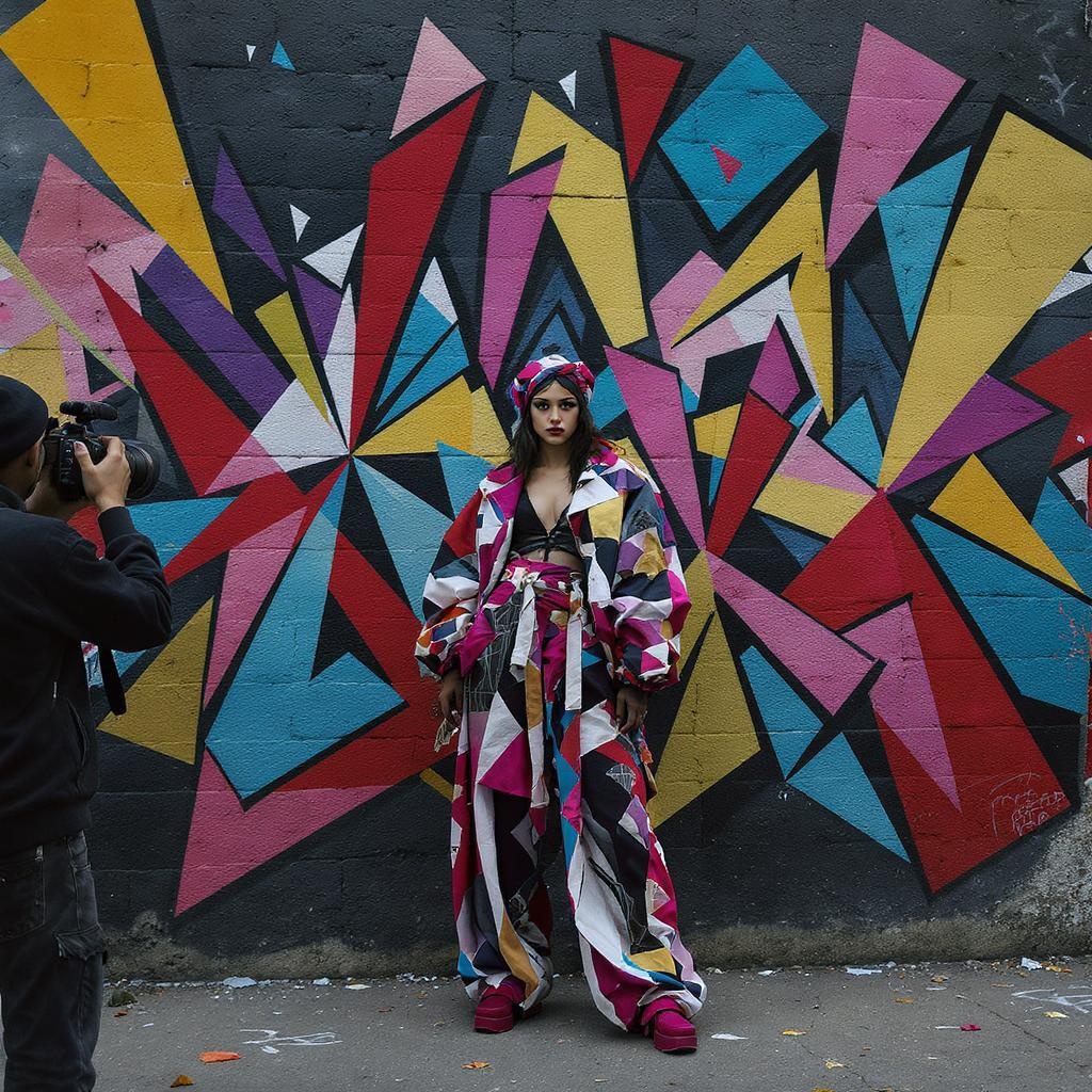 A vibrant 90s street scene unfolds in Santiago, where a street photographer captures a striking model exuding confidence as she poses against a backdrop of abstract graffiti composed of bold, colorful geometric forms. Her attire, reminiscent of avant-garde pieces from Tokyo Fashion Week, seamlessly merges with the vivid mural, creating an intricate tapestry of color and design. The ensemble showcases elaborate details that echo the graffiti's dynamic energy, resulting in a captivating fusion of fashion and urban art.