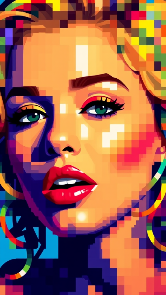 A vibrant, abstract mosaic of colors blurring together to form the iconic features of a well-known pop star, her face rendered in a pixelated style.