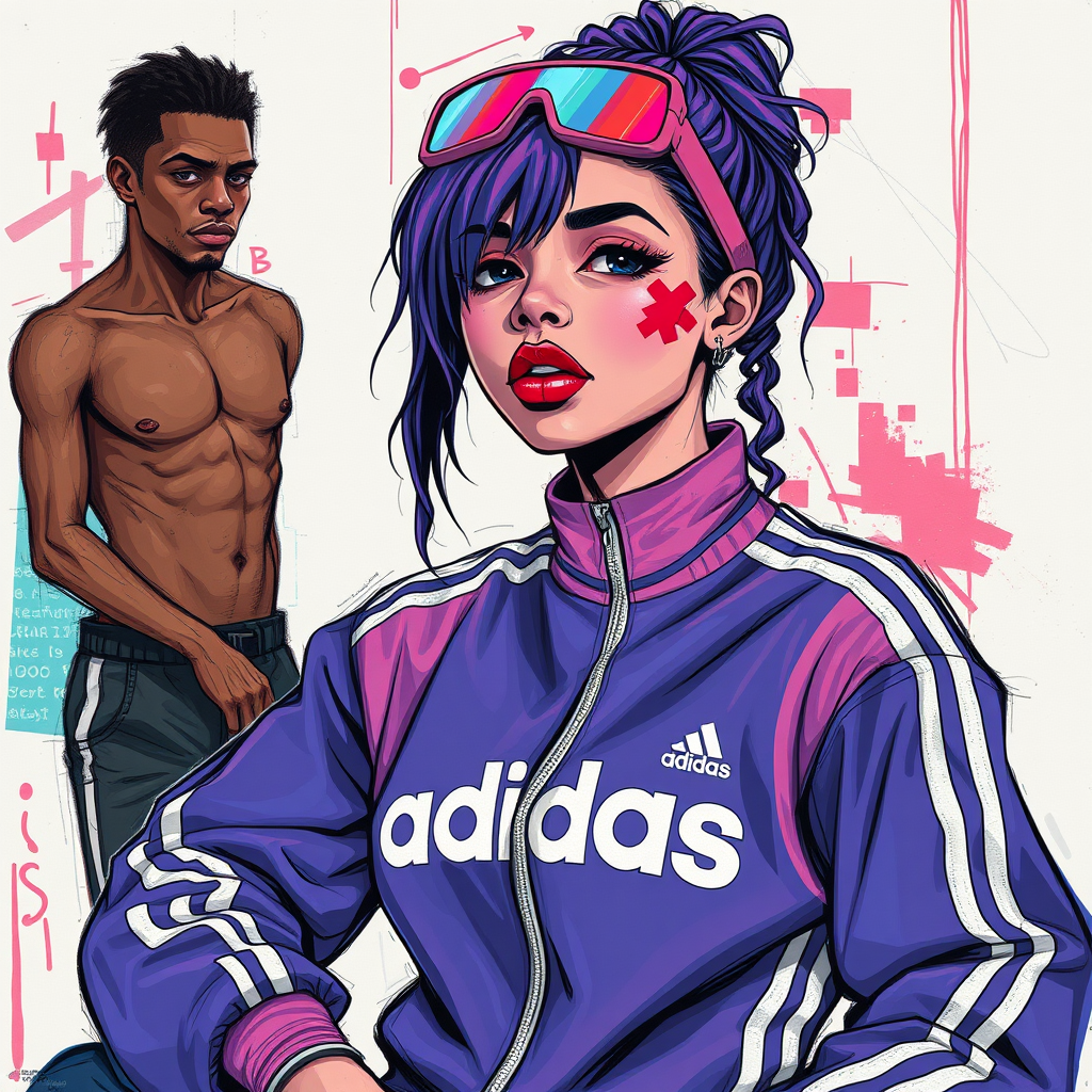 A vibrant, abstract portrayal inspired by Jean Michel Basquiat featuring a cyborg girl in a retro Adidas tracksuit, exuding a sporty, affluent 80s vibe. The scene is reminiscent of vintage photography, where the juxtaposition of a naked black man adds a layer of complexity, echoing the style of Manet. The composition combines elements of cartoon sketches and abstract art, intentionally embracing imperfections and a raw, expressive quality.