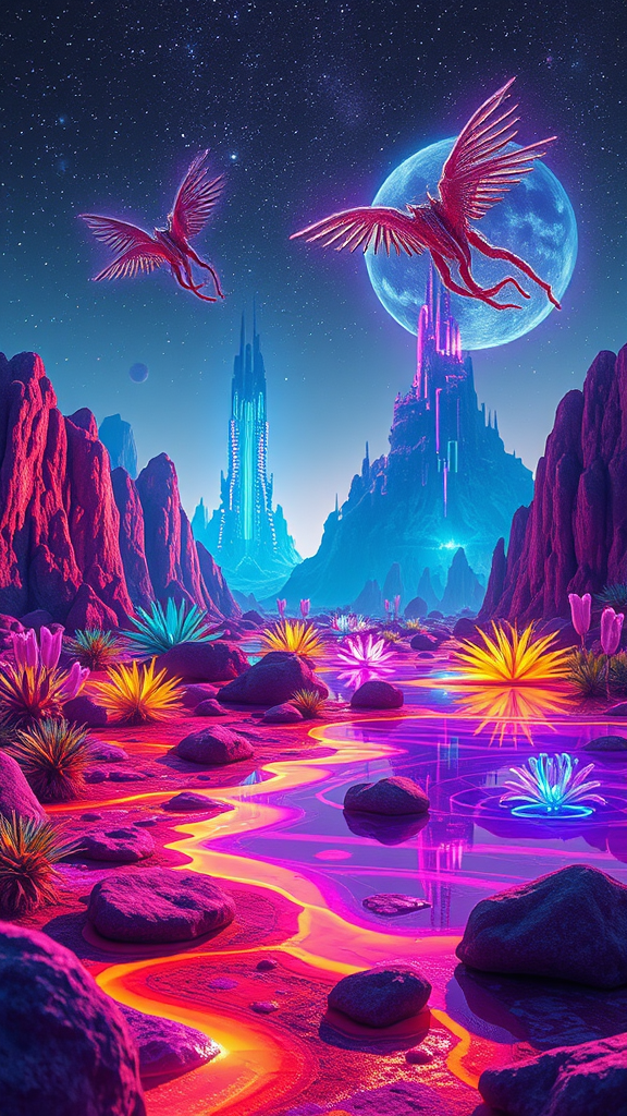 A vibrant alien landscape bathed in neon hues, where luminescent flora and otherworldly rock formations glow under a star-streaked sky, casting reflections in shimmering pools of liquid that seem almost alive. Towering alien structures loom in the distance, their surfaces pulsating with colorful light patterns, as strange, ethereal creatures glide effortlessly through the air in a surreal dance of color and motion.