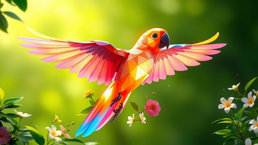 A vibrant and abstract 3D parrot with geometric wings soars gracefully, its radiant body intertwined with lush foliage and delicate flowers. Its feathers emit a soft, ethereal glow that gently illuminates the surrounding verdant landscape, casting playful patterns of light and shadow as it flits through the air against a serene green backdrop.