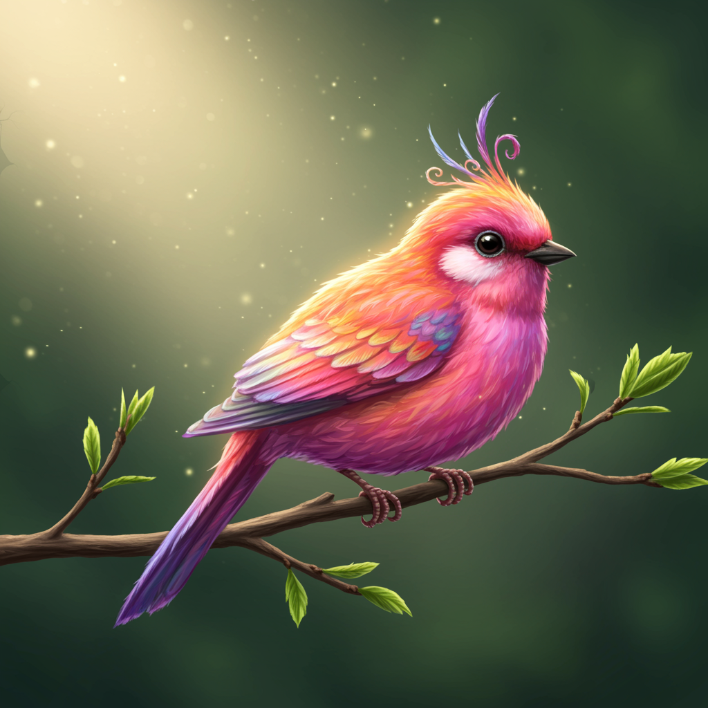 A vibrant and charming fantasy bird with shimmering feathers in an array of bright colors, exhibiting innocence and playfulness as it perches on a delicate branch. Intricate details showcase its delicate features, surrounded by a magical glow with fairy-like lighting. Soft, volumetric rays of sunlight filter through the forest canopy, highlighting its iridescent plumage in an enchanting, photorealistic manner, creating an atmosphere of wonder and enchantment, enhanced by high dynamic range for an immersive visual experience.