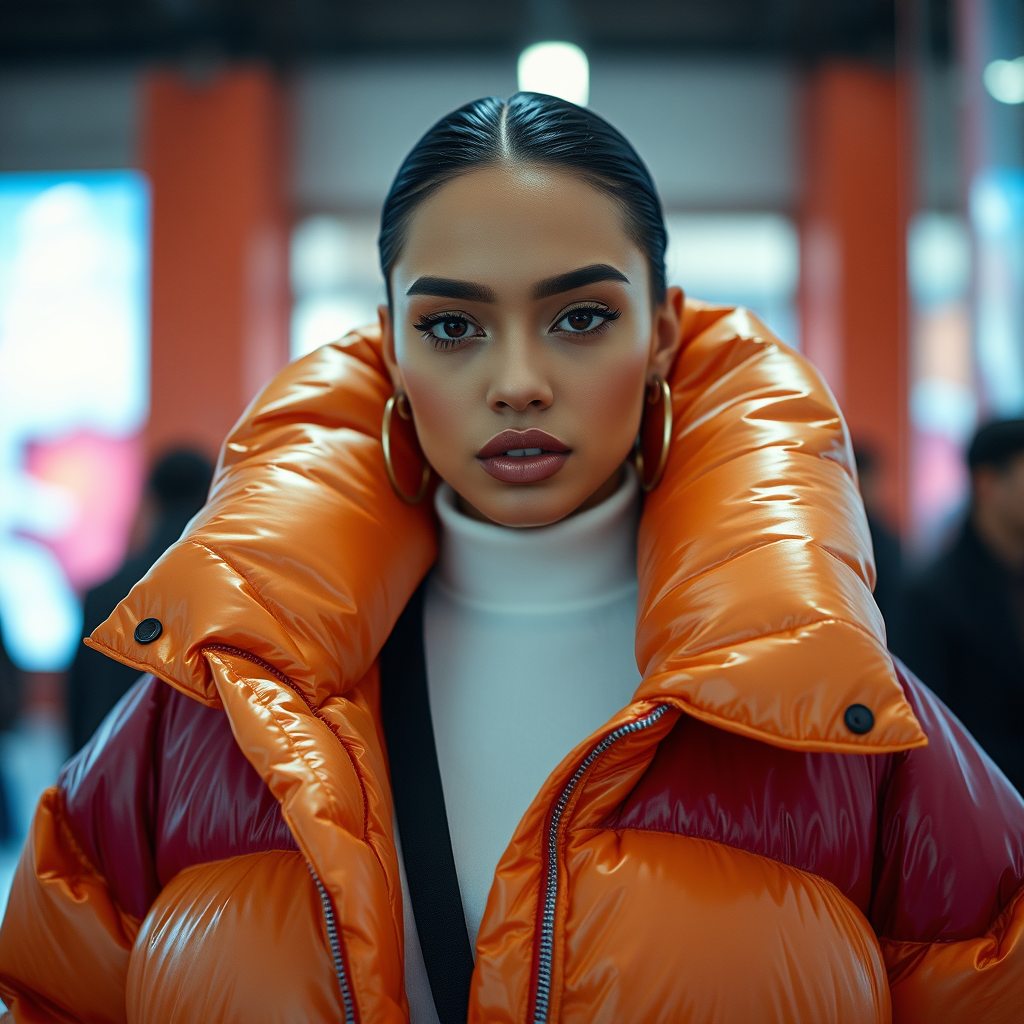 A vibrant and cinematic fashion portrait of an extraordinarily stunning woman wearing an oversized puffer jacket inspired by the avant-garde styles of Craig Green, Dingyun Zhang, Yeezy, Balenciaga, and Vetements. The image is sharp and detailed, with a glossy and glamorous appearance that evokes a sense of high-fashion editorial elegance. The composition is symmetrical and refined, reminiscent of a Vogue magazine shoot, capturing the essence of modern luxury and style. The scene is well-lit, enhancing the allure and sophistication of the outfit, with subtle nods to Off-White aesthetics.