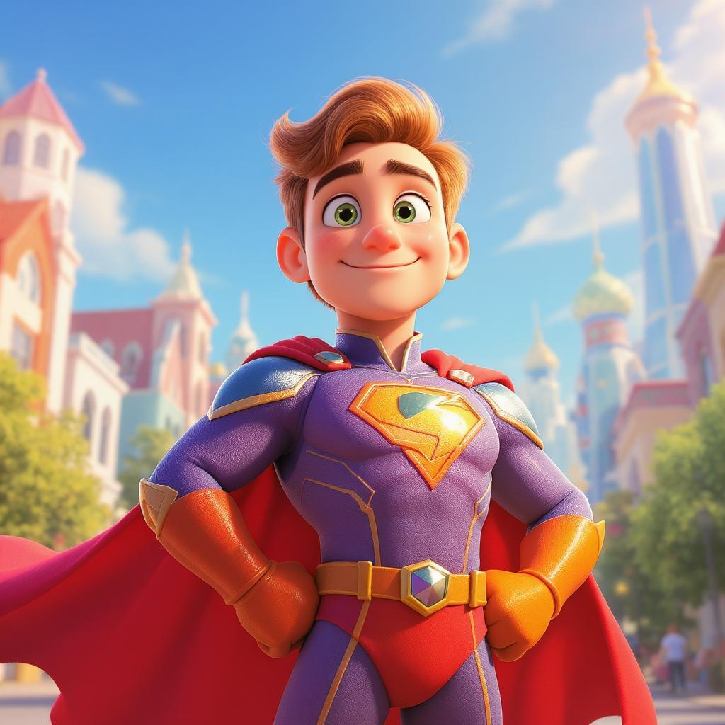 A vibrant and colorful 3D image in the style of a Pixar animation features a heroic figure in a detailed and imaginative superhero costume. The scene is bathed in warm, sunlit hues, creating a lively and cinematic atmosphere. The superhero stands confidently, their dynamic pose and flowing cape accentuating their powerful presence. The background showcases a bright, cheerful cityscape, with stylized buildings and lush greenery under a clear blue sky. The character's costume is intricately designed, blending elements of classic superhero aesthetics with a modern twist, and their expression exudes determination and optimism.