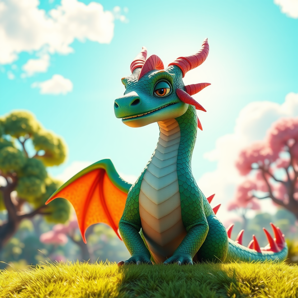 A vibrant and colorful 3D rendering of a dragon basking in sunlight, with a Pixar-inspired, cinematic feel. The dragon's scales glisten with a mix of emerald and sapphire hues, reflecting the sunny day. It stands majestically at the edge of a serene, enchanted forest, with lush, imaginative trees swaying gently in the light breeze. The scene captures a sense of wonder and adventure, with a whimsical atmosphere enhanced by soft, stylized clouds drifting lazily in the bright blue sky. The dragon's eyes are gentle and wise, hinting at ancient stories and a lively spirit.