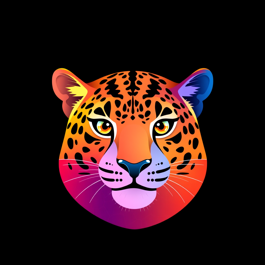 A vibrant and colorful 3D vector art design features a silhouette of a jaguar with sharply defined eyes, embodying a sunset palette. The artwork, perfect for T-shirt art, presents the jaguar in a low-poly style with a quirky and playful expression. Set against a black background, the design incorporates a watercolor effect to add fluidity and depth. The piece is rendered in a bird's-eye view and isometric style, exuding a retro aesthetic with soft lighting that accentuates the character. The jaguar is the focal point, its vivid hues and photorealistic details achieved through Cinema 4D, displayed from the front side in stunning 4K resolution.